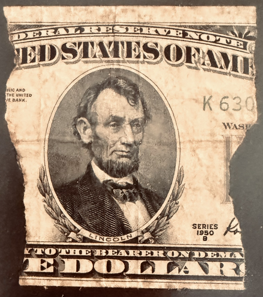 Marvin Lee Aday, better known as the singer Meatloaf lived in Dallas when he was 14-years-old. On the day of JFK’s visit, Meatloaf with two of his football buddies, Billy Slocum and Jimmy McCorder went to Love Field to see the President. The crowds were huge and so the boys decided to park beside an exit gate. Jimmy’s dad worked for Love Field and he believed this would be the exit for the motorcade…and it was! As the limousine was leaving, they stop at the gate and Billy shakes the President’s hand. The boys then drive to Market Hall to see the President again. While waiting at Market Hall a Secret Service Agent stops the boys from parking. He shows his badge and says, “Move over, I’m driving.” He drives to Parkland Hospital and agents have guns drawn everywhere. He says to us, “Do not get out of this car.” After about 45 minutes, they announced President Kennedy had died. The Secret Service Agent came over and offered to pay for the gas and pulled out a $100 bill. We all said, “Oh No.” He then said, “Well, at least let me give you five dollars.” So we took the $5 and we tore it into three pieces and each of us took a piece as a memento. This piece belonged to Billy Slocum.